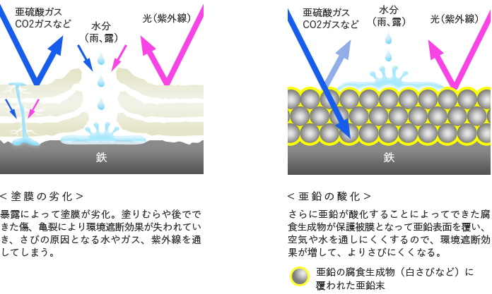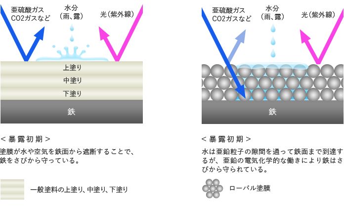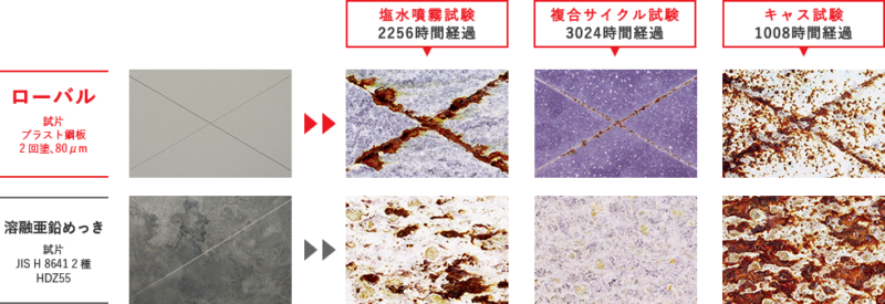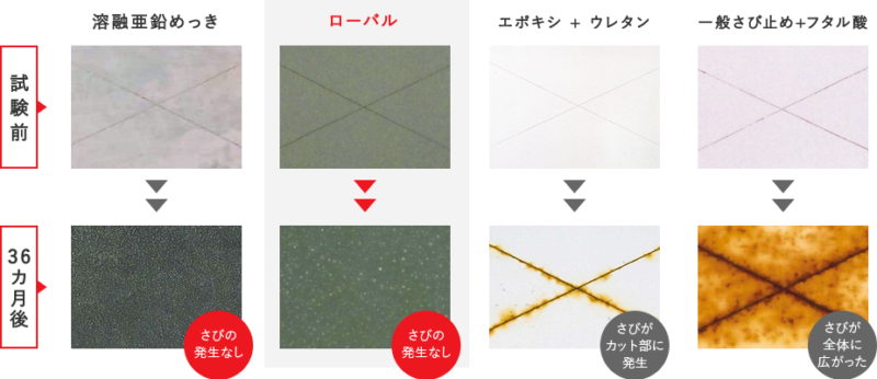 ローバルは、溶融亜鉛めっきと同等の防食性能が証明されています