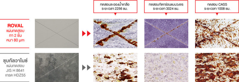 ผลการทดสอบประสิทธิภาพการป้องกันสนิมเทียบเท่าการชุบกัลวาไนซ์เกรดสูงสุด (HDZ55) โดยการทดสอบแบบต่างๆ