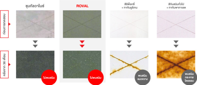 สีทากันสนิมโดยทั่วไปจะมีส่วนผสมหลักของสารพาทาเลต สนิมจึงเกิดได้ในระยะเวลาเพียงไม่ถึงปี แต่ด้วยประสิทธิภาพในการป้องกันสนิมระดับสูงของ ROVAL พิสูจน์ให้เห็นว่าสามารถกันสนิมได้อย่างดีเยี่ยมเป็นระยะเวลานาน แม้ในสภาพแวดล้อมที่เอื้อต่อการกัดกร่อนอย่างรุนแรงก็ตาม
