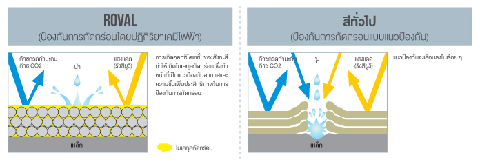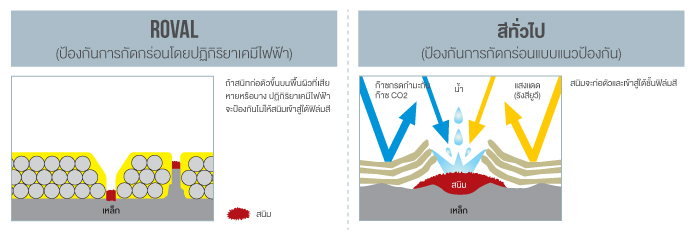 ROVAL ปกป้องพื้นผิวจากการเกิดสนิมโดยใช้คุณสมบัติปฏิกิริยาเคมีทางไฟฟ้าของสังกะสี ผงสังกะสีทำให้เกิดการป้องกันการกัดกร่อนแบบทำลายตัวเองให้กับพื้นผิวโลหะ ถ้ามีสนิมเกิดและทำลายพื้นผิวที่มีการเคลือบบางๆ ปฏิกิริยาเคมีไฟฟ้าก็จะป้องกันไม่ให้สนิมคืบคลานเข้าไปใต้ฟิล์มของ ROVAL